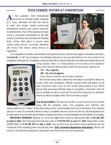 The voting device contains several buttons (see photo); however, only two keys apply to convention attendees: